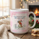 This is a hand drawn funny christmas pink mug with pink bow cartoon illustration plaid style background, Customize your own text and background to make this design more unique and special for this festive occasion.