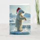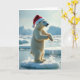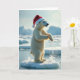 This card shows a polar bear in the Arctic, standing on ice with a Santa hat, looking festive. The bear's white fur shines in the soft light, and it looks like it's splashing joyfully in the water. Its face has a hint of mischief, but also gentleness. The background is calm, with icy mountains and blue waters. The focus is on the bear, giving a feeling of peaceful solitude. It's a mix of nature and holiday joy! This card is perfect for spreading holiday cheer 🎅🏼🎄🎁.