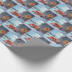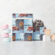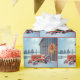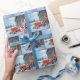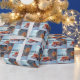 Red vintage farm tractor decorated with glowing white lights beside a rustic old barn adorned with a Christmas wreath in the snow