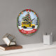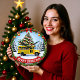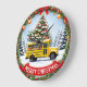 This cheerful clock features a classic yellow school bus loaded with brightly wrapped presents, parked in a snowy winter forest next to a decorated Christmas tree. The bus is framed by a festive wreath of pine boughs and ornaments, with a prominent red banner that reads "MERRY CHRISTMAS" across the bottom. This design blends a familiar vehicle with warm holiday cheer, making it a unique seasonal decoration.