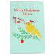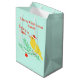 A Christmas, yellow singing canary wearing a Santa hat and perched on holiday greenery. He sings a Christmas tune of, "Fa la la la laaa..." Canary lovers are sure to enjoy this festive pet bird design for Christmastime! It's shown here on a medium gift bag with a custom Merry Christmas message and name. You can change the text to any text you prefer and choose any background color instead of the light green. Festive and unique gift wrapping for bird lovers!