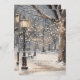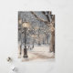 A quiet winter night scene featuring softly glowing street lamps, falling snow, and string lights in a peaceful park setting. This illustrated Christmas card captures a calm, timeless holiday mood. The message reads Wishing you peace, joy, and happiness this holiday season with space to personalize your name or signature at the bottom.
