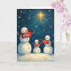 The greeting card features a trio of snowmen against a serene winter backdrop, exuding infectious cheer and festive vibes 🎅🏼🎄🎁 Their joyful expressions and whimsical details, like carrot noses and rosy cheeks, add an endearing touch. The deep indigo-teal sky dotted with stars and a radiant golden star creates a picturesque, dreamlike setting. The snowmen holding up vibrant red signs that read "Joy To The World" offer a bold contrast and convey a heartwarming message. Perfect for spreading holiday cheer, this card is sure to bring smiles and warmth to anyone who receives it.