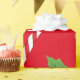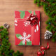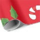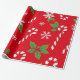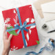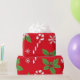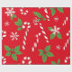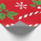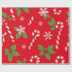 This image shows a red background featuring green holly leaves and a candy cane with white and red stripes. It is a festive wrapping paper design perfect for wrapping Christmas gifts.