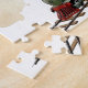 Vintage-style red and green Christmas train winding past cozy chalets and tall snowy pines in a winter mountain village, designed as a charming jigsaw puzzle. A relaxing holiday activity and nostalgic gift for train lovers, families, and anyone who enjoys classic Christmas village scenes.
