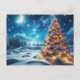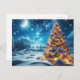 This design features a beautifully, illuminated Christmas tree covered in snow, sparkling with warm lights and vibrant red and blue ornaments, under a starry sky and a crescent moon.