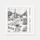 These elegant black-and-white Christmas napkins feature a beautifully illustrated winter village, evoking the quiet charm of a storybook scene. Delicate linework captures snow-covered rooftops, pine trees, and a winding stream beneath a stone bridge, all bathed in a soft, vintage glow. A slender church steeple watches over cozy cottages, while distant mountains fade into a dreamy horizon. The design is airy and serene, inviting warmth and nostalgia. At the right of the illustration, you can personalize the “Merry Christmas” message.