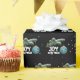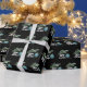 "Joy to the World" text with globe ornament hangs from a snowy pine tree branch, illuminated against a black night sky filled with shimmering stars.
