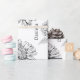 Black on white line art drawing of two Chrysanthemum flowers with a sprig of fern and a personalized name. This is original hand drawn art from Dogwood & Thistle Art and Design.