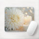 En stor, delikat vit krysanthemumblomma placeras bredvid två tända ljus, skapande en lugnande och varm ambians.