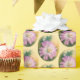 Söt blomning är dekorerat med en mönster av blommigt-teckningar som skildrar en lila-rosa- och krämvit krysanthemum-blommar med en kuk och löv mot guldfärgad och oliv grönt på en gult baksida av en smörkärta.