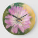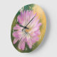 Den här söt blommigtens väggklocka är dekorerad med teckningar som skildrar en lila-rosa och en grå, vit krysanthemum-blommar med en kväve och löv mot guldfärgad gult och oliv grönt tillsammans med blekens gulter som beskrivs i mörk grönt.