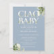 Ciao-inbjudan till babydusch för hela ett-babyduschen med information om registrets QR-kod och babyduschdetaljer som anges i elegant, söt botaniskt grönt bladtypografi på dammig blå bakgrund. Designad av Thisisnotme©