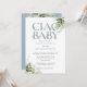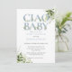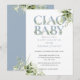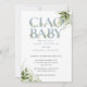 Ciao baby shower-inbjudan med elegant dammig blå typografi och vacker botanisk grönska. Designad av Thisisnotme©