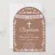 Hedra din lilla en dop med denna vackra, bågformade mexikanskinspirerade dopinbjudan! Med ett elegant vitt kors, graciöst "Dop" -manus, en vit papel picado-banner, invecklad folkkonstblommig kant och två kärleksfåglar längst ner – allt ramad i en modern bågform på en varm terrakotta brun bakgrund. En rörande och meningsfull design som perfekt kombinerar modern stil med traditionell latinamerikansk kulturarv.