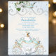 Det här viskfulla och spännande födelsedagsfest inbjudan har ett Cinderella Fairy Tale-tema. Vid grund placeras en pumpvagn i prinsessan stil med ändarna vid guld och glitter. En diamant blommigt gräns överst har en matchande teal och guld prinsessan krona överst. Glitter-diamanterna pekar på den övre delen och grund.