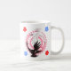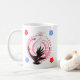 This romantic 11 oz coffee mug features an original circling swan illustration symbolizing balance, devotion, and enduring love. A black swan and a white swan move together in and endless loop, surrounded by soft pink roses and celestial geometry, with the Latin phrase "Amor Vincit Omnia" -love conquers all-woven into the floral design.