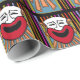 En cirkuss ljusa färger och girighet är ett val av perfekt för presentemballering som är papper för nästan vilken tillfälle, ålder eller gender som helst. Den här utformningen har en bakgrund av nyfiskat rand i flerfärgat färg, som växlar med svart och överlagrad w/ poster av en clown med underbart stort leende.