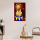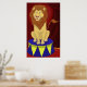 Ett poster med en illustration av en cirkus lejona sitta på ett blått och gult-podium. Han lyser i strålkastarljuset och en vacker röd ridå med guld-trim ligger bakom honom. Denna lejona poster i tecknaden skulle göra en underbar gåva till för barn, stort kattälskare och människor som kärlek cirkusen.