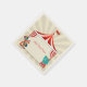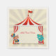 En papper napkin med röd och vit cirkus tält, en blå elefant och en clown med ballonger. Koordineringsposter tillgängliga.