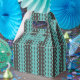Cirklar och stygn på ränder i poolblå (akvamarin) och kol (nästan svart). Andra typer av presentaskar med denna design finns också tillgängliga i andra färger.