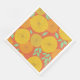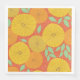 Ljusa och färgfulla blommönster fyller scenen, med överlappande cirkulära orangar och gulter som ställs in mot en pulserande bakgrund av orangen. Grönt löv och små vita prickar ger kontraster och detaljer, vilket förbättrar det livliga och trevliga utseendet.