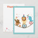 I linje med den cirkusdjurs-tema födelsedagsfest för barn, balanserar detta lekfulla platta tackkort design och gott om tomt utrymme för att handskriva ditt meddelande. Den ena sidan har en björn som snurrar tallrikar, ett lejon som cyklar på enhjuling och en jonglande säl på en strandboll - allt medan de balanserar på en lina. Roliga färger plus en snygg blå kant. Den andra sidan säger "Tack" i två nyanser av orange och fantasifulla grafik längst ner. Koordinater med samlingen Cirkus Djur av Hopscotch Prints.