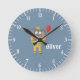 Söt blå väggklocka för en barnkammare eller ett barns rum med en elefantclown . Personifiera den med barnets namn