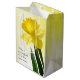 Citationstecken: "När jag ser en påsklilja, är det så hårt att inte le.", En vårdesign som skapas med inklusive blandat massmedia: naturen/blom- fotografi av en gul påsklilja, en digital bakgrund av slumpmässig gult och grått görar strimmig, och ett blommacitationstecken.