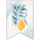 Denna eleganta och trendiga bröllopsdekoration med citron och blå blad-flaggor med akvarellbakgrund är perfekt för ett modernt och stilrent bröllop. Den moderna vintage-designen visar vackra romantiska Sicilieninspirerade akvarellcitroner på en gren med blå blad. Romantisk botanisk tema-illustration för ett chic bröllop.