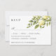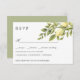 Den här eleganten botaniska OSA kort är designad för att samordna med vår samling av citroner och Löv i vattenfärgen blommigt bröllop och har en sofistikerad vattenfärg gren av citroner och löv i gult på kortets övre höger med önskat svarsdatum och måltid eller val av inmatningsalternativ. Kort tillbaka till en samordnad grönt. En modern och klassande utformning för elegant chic bröllop för vilken säsong som helst eller för bröllop på landsbygden. Vi kan byta färg, typsnitt och annat för att göra din design unik personlig. Kontakta oss via butiken eller skrivan på citronelladesign@gmail.com om du behöver hjälp eller anpassningsbar.