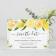 Den här glada Save the Date-korten har en livfull blandning av gula rosor, citronskivor och frodig grönska som ramar in en elegant centrallayout. Blandningen av script- och serif-typografi ger en raffinerad, modern touch, medan det ljusa citrus-blommiga konstverket ger värme och personlighet till din bröllopsannons. Perfekt för vår- och sommarbröllop, utomhusfirande, destinationsevenemang eller par som älskar färsk, solig brevpapper, sätter denna Save the Date tonen vackert och passar sömlöst med en matchande citrus-tematisk svit.
