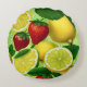 En livfull rund kudde med ljusa citroner, limefrukter och jordgubbar i en frisk botanisk stil på en mjuk grön bakgrund. Den glada sommarpaletten lägger till en livlig accent i vardagsrum, sovrum och mysiga läshörnor. Ett stilrent val för kvinnor som älskar fruktiga mönster, färgrik inredning och presentfärdiga accessoarer för hemmet.