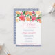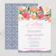 Bjud in gäster till en överraskningsfest som firar en älskad dam på hennes födelsedag. Jag ville att denna design skulle framkalla känslor av en varm sommarafton med luften doftande av lokala blommor. Denna feminina och slående inbjudningsdesign har livfulla rosa akvarellblommor och djärva citrusfruktdetaljer, kompletterade med mörkblått och vitt kakelmönster på framsidan av inbjudan och på baksidan.