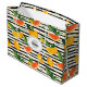 Den här sömlösa mönster-presentpåsen brinner med färskhet, med orangar, citroner och limpor - hela och halva skivade - som finns bland lush grönt lövs. Citrus inslag går mot grönt och vit lodrät strimlad bakgrund och blandar fruktig vibration med ett mjukt, rent estetiskt. Perfekt för sommarvibes, tropiska teman och roligt, ljusare design.
