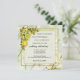En bröllopsinbjudan med vattenfärgad målad löv med citron-, citrusfrukter och blommor. Bakgrunden är en lätt pastellsceneri av en fruktträdgård med stiliserad inramning av elegant guld.