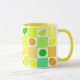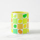 Ett citrusfruktkaffe mugg med ett färglöst återmatningstemat mönster av citroner, kalk och orangar på kvadrater av vitt, orange, teal och gult.