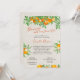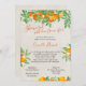 Bröllopsinbjudan via post med färska citrusapelsiner och apelsinblom. Designen är skriven med titeln "Duschad med kärlek från fjärran" och all resterande text är helt redigerbar. En utsökt akvarelldesign på en naturlig, vintagebakgrund med elegant handskriven typsnitt.
