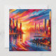 Ett vibrerande solnedgång över ett spännande citysskum, med varm orange och rosa som reflekterar av glasets skyscraper.