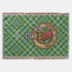 Clan Currie tuppkam vapensköld omgiven av en rem och spänne över tartan bakgrund. Anpassad text.