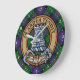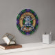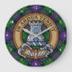 Clan Malcolm or MacCallum crest badge surrounded by a strap and buckle over tartan background. Custom text.