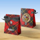 Clan Wallace crest badge surrounded by a strap and buckle over tartan background. Custom text.