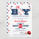 En modern inbjudan till babydusch med ett basebolltema, med en klassisk vit bakgrund, marin blå och röd text, en baseboll, stjärnor, en hjälm med fladdermus och boll och en sportig babyduschmall som är lätt att anpassa.