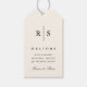 Elegant bröllop monogramdesign har initialer i klassiskt svart serif-tecken som är skilt från ett tunt lodrät på en varm elfenbensbakgrund. Anpassa med tre redigerbara fält. De visas med ett välkomstmeddelande och skapar de här märkrna perfekten som avslutar beröring till dina välkomstpåsar för bröllopet.
