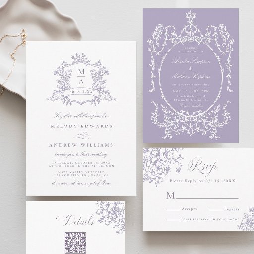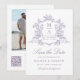 Elegant lavender vintage floral crest wedding save the date card with a photo and a QR code on the back — perfect for a modern classic or romantic vintage wedding. For more advanced customization of this design, please click the DESIGN TOOL BUTTON above!
