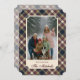 This elegant and contemporary holiday card features a plaid pattern that includes a "With Love From" message along with your family name. It showcases shades of green, dark blue, red, and ochre yellow, creating a classy and nostalgic English holiday ambiance. You can personalize the card by adding your family photo on the front and text on the back. This card is perfect for sending Christmas messages and wishes in a traditional colonial style, making it an excellent choice for a charming and sophisticated theme.