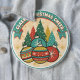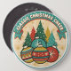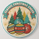 Celebrate the season with timeless charm in this vintage-inspired Christmas design. Set within a circular frame, a warm cream radial burst background with golden starbursts creates a nostalgic holiday glow. Stylized evergreen trees in festive shades of green, red, and yellow are dusted with snowy white dots, while the foreground features colorful retro Christmas ornaments in teal, red, yellow, and blue, each adorned with classic patterns. A teal polka-dot banner across the top reads “CLASSIC CHRISTMAS CHEER,” and a lightly distressed texture completes the old-fashioned look. Perfect for anyone who loves retro style and traditional holiday warmth.