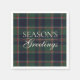 This elegant paper napkin features a plaid pattern with the classic "Season's Greetings" message. It showcases shades of green, dark blue, and red, evoking a classy and nostalgic English holiday ambiance. It is perfect for decorating a Christmas-themed table setting in a classic colonial-style home, as well as in a country cottage, log cabin, or vacation home by a lake or river.