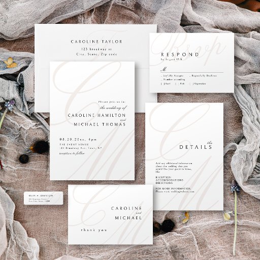 Moderna klassiska minimalistiska bröllop-menykort har elegant calligraphy-par monogram och timellös serieteckenhändelseinformation i färg, redigerbar beige, svart och vit, enkel och sofistikerad, Underbar för formellt vintage bröllop, romantiskt traditionellt bröllop, modern klassisk bröllop under alla säsonger. Visa alla matchande delar i samlingen.