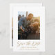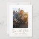 Elegant bröllop sparar datumkortet med en enkel och minimal design med "Spara datum" i en modern typografi tillsammans med din händelseinformation under lodräts favoritbild. Baksidan har ett andra bild tillsammans med en valfri textrad över bild grund. Temat färg är guld och vitt och kan ändras vid designredigeringen av verktyg. Det är underbart om du har ett informellt eller formellt bröllop.